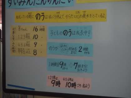 すいみんは,脳を休ませるためにとても大事だということや,4年生は,脳を元気にするために9時間のすいみんが必要なことを勉強しました。