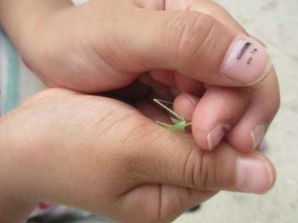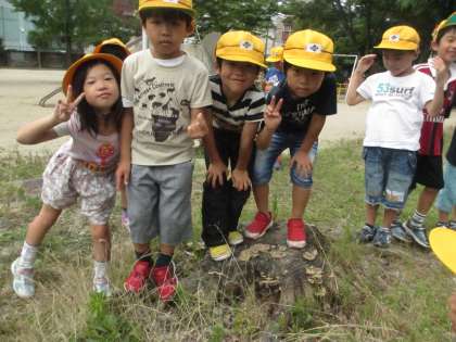 子どもたちは、見つけるやいなや「先生!こっちこっち!」と大騒ぎ。みんなが群れになって見つけた植物や虫を観察していました。