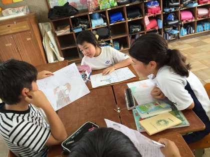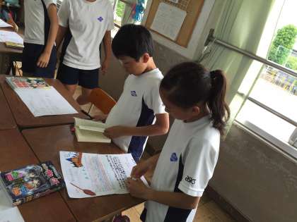 友達の書いた紹介文を読み,自分の読んでみたい本ナンバーワンに,おすすめシールをはりました。