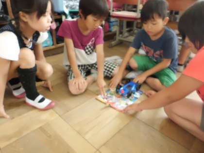 今日は“どうすれば車を動かすことができるのだろうか?”という学習問題を立て,子どもたちが様々な方法を試しながら,車を動かしてみました。