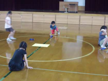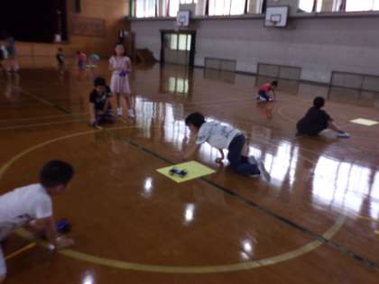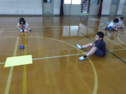 前時でいろいろな車の動かし方を発見した中で,今日はゴムに注目し,体育館でぴったんゲームをしました。