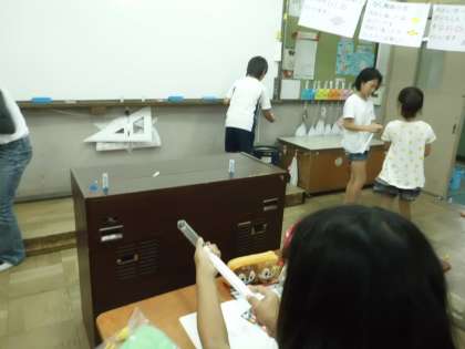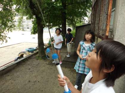 空気や水を使ったおもちゃを組み立てて,的当てをしたり,どのくらい飛ぶか競争したり,空気でっぽうと水でっぽうのちがいを確かめたりしました。