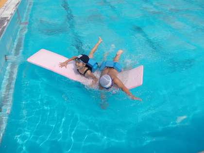 ビート版をヘルパーをつけて、バタ足でたくさん泳いだり、大きなビート版につかまって、プールの端から端までまっすぐ移動できるかどうか挑戦したりしました。