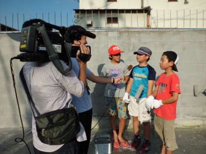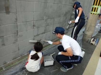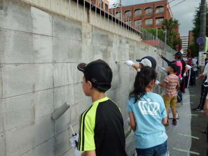 環境を整えることで犯罪を防止できるように、子どもたちと警察学校の方、地域のみなさん、大学生の方と協力して、警察学校の壁をきれいにペンキで塗りました。