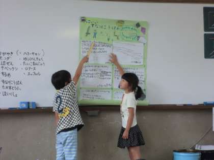 発表の後は,たくさん質問が出て,「その機械はどんな形ですか。」という質問に絵を描きながら説明したり,後日,そのお店に家族と行った時の話を返したりして,上手に答えていました。