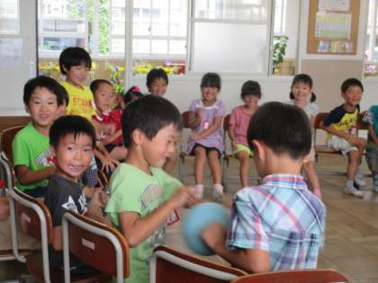 みんなで輪になり,ボールを回し続けるゲームです。音楽が鳴っている間は回し、止まったときにボールを持っていた人が鬼です。