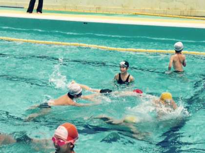 他の学校のお友達と一緒に輪になって踊ったり、自由遊びや泳ぎの練習をしました。