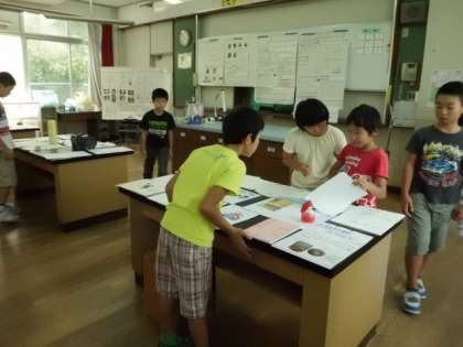 5・6年生が夏休みにがんばって作った自由研究の作品を、4日と7日の中間休みに理科室で展示しています。作品展には5・6年生以外にも2〜4年生の子どもたちも見に来ていました。