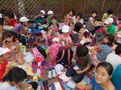 オリエンテーリングをがんばったあとは、待ちに待ったお弁当です。ちょうど雨が降り出したので屋根の下でしたが、みんなでワイワイ食べることができました!