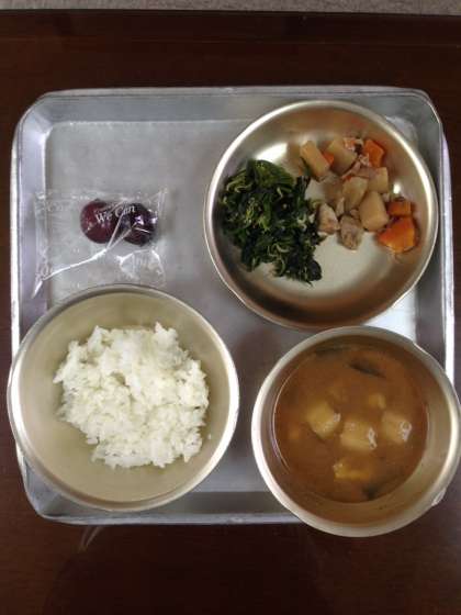 そして,今日の給食は,「ごはん・煮しめ・ほうれんそうとじゃこのいためもの・みそ汁・ぶどう」です。今年から始まった『和(なごみ)献立です。』