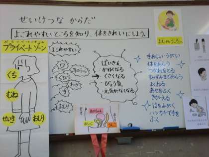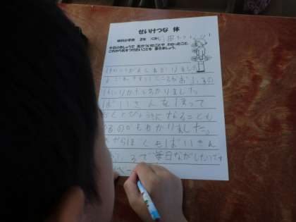 学活「せいけつなからだ」では,体の汚れやすいところはどこか考え,きれいにするためにはどうすればいいか話し合いました。お風呂の入り方も学び,「体を洗わずに湯船に入っちゃだめなんだな。」「体をふく時には耳の中までふくといいんだね。」「妹にも教えてあげよう。」とふりかえりを書いていました。
