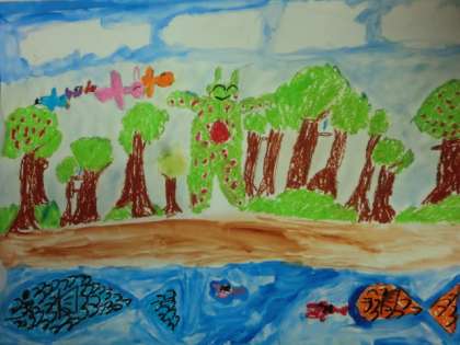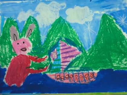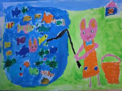 図工で描いているお話の絵が完成しました。絵の具を使って描いたので,1年生の時よりも色彩豊かに仕上がりました。