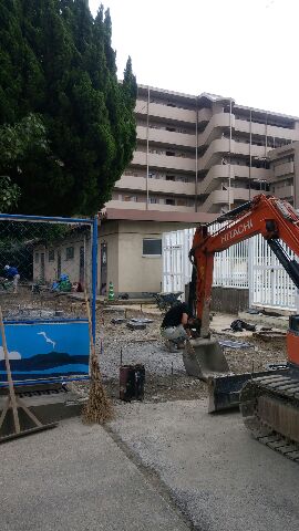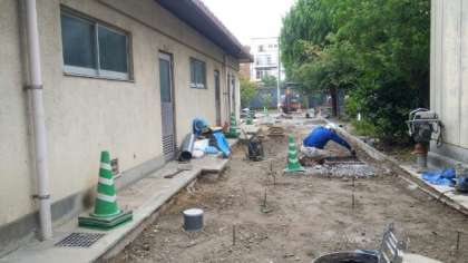 学校では,災害用マンホールトイレの設置工事が行われています。
