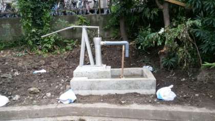地下に設置された雨水貯留槽に貯まった雨水を,写真の手押しポンプで