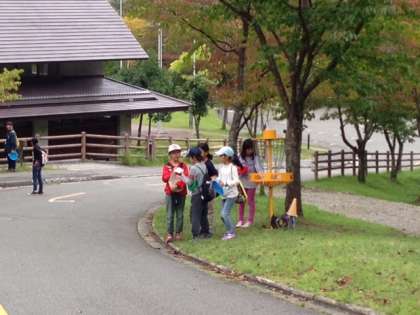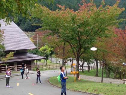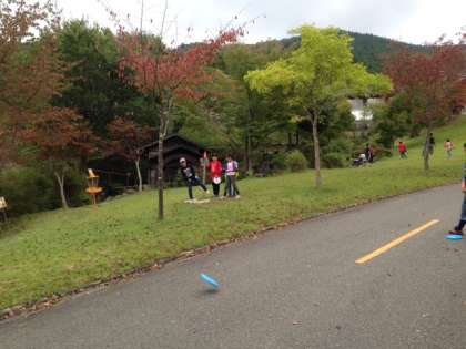穏やかな秋晴れの中,自然を満喫しながら「フライングディスク」の後半組が,頑張っています。