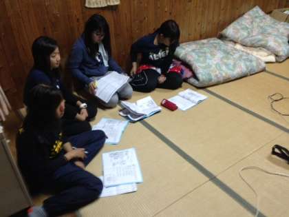 今日の子どもたちの健康や活動の様子を話し合い,明日のプログラムを入念に確認しています。
