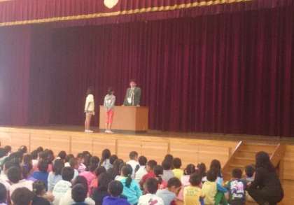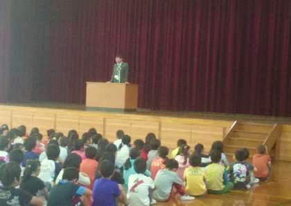 校歌を元気よく歌った後,校長先生のお話です。