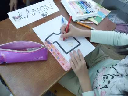好きな色や形の尋ね方を教えていただきました。それを尋ね方を使って,好きな色と形を聞き,友だちの為にTシャツを作りました。