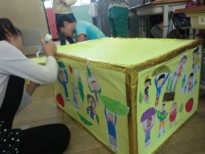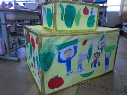 おみこしの飾りつけをしました。たくさん収穫できた野菜へ感謝の気持ちを込めて,飾りをつけています。運動会にお披露目するのが楽しみです。