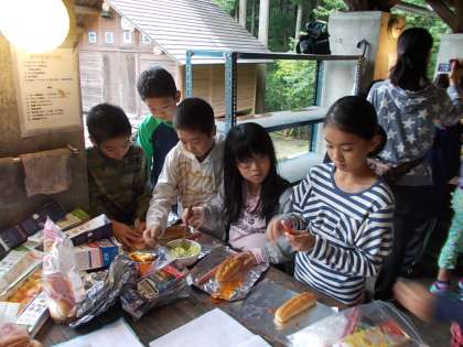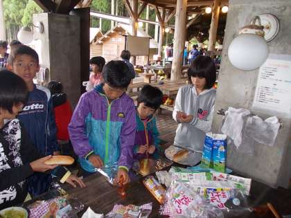 2日目の朝ごはんはカートンドッグでした。パンに具を挟んでアルミホイルで包み、牛乳パックの中に入れて火をつけて焼きました。隙間のないようにアルミホイルで包めたのでおいしくできました。