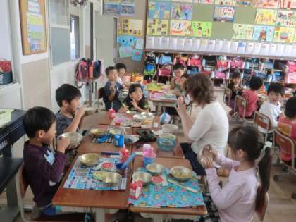 給食が終わったら,「センキュー」「シーユー」とあいさつもできていました。