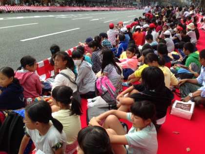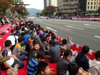 河原町御池の北西の指定された観覧席に座って行列を待ちます。