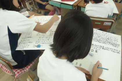 バリアフリーやユニバーサルデザイン,盲導犬,手話などについて調べたことを,ポスターにまとめています。