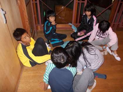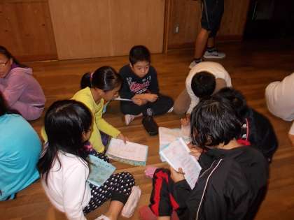 夜のふりかえりの様子です。今日一日のふりかえりと、明日の予定の確認をしています。しおりを確認しながら話し合ったり、眠い目をこすってがんばって話を聞こうとしたり、夜寝る前も一生懸命でした!