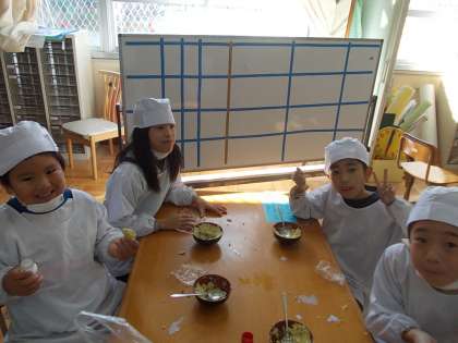 ふかしたおイモをスプーンを使ってつぶして、ラップに包んで、きれいな形の茶きん絞りを作ることができました。