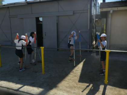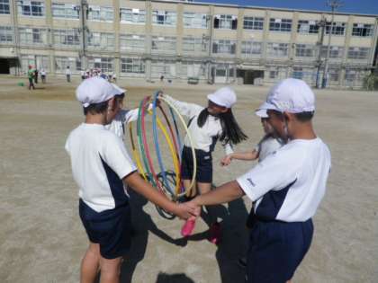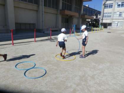 体育では,ようぐあそびをしています。今日は,竹馬,輪,ボールを使った遊びをグループで考えて,いろいろな遊びに挑戦しました。