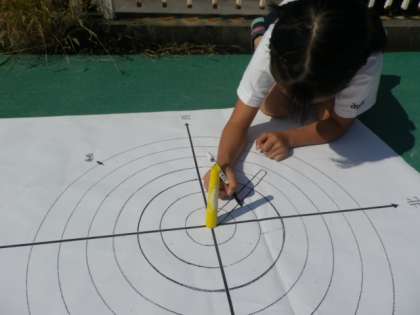 理科では,『太陽の動きと地面のようすを調べよう』の学習をしています。この日は,プールサイドで,1時間ごとのかげのむきを観察しました。グループで協力し,順番に観察記録をとっていきました。