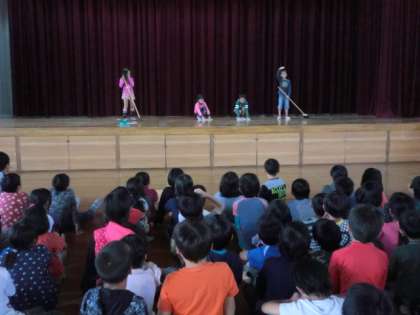 学芸会の練習,がんばっています!今日は,初めて体育館で練習をしました。大きな体育館でみんなに見られて演技をすると,とても緊張したようです。