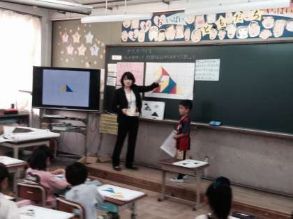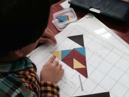 写真にあるように1人1人にホワイトボードの上で問題にある影絵と同じ形を色板で並べる学習でした。どの子も色板を回したり、裏返したりしたりして試行錯誤しながら完成させていました。同じ形が作れたときは「やったできた!」と声を上げて喜んでいました。二人ペアになってお互いの並べ方を説明することにも挑戦しました。