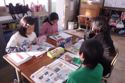 疏水工事の絵を手がかりにして,工事の様子について気付いたことや,疑問に思ったことなどについて,グループで話し合いました。