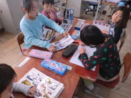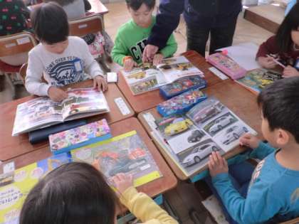 ”じどう車くらべ”の学習のまとめとして,各クラスで自動車図鑑をつくります。