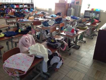 今日は、休み時間に地震があった時の避難訓練を実施しました。教室にいる子は机の下に入って椅子の脚をしっかりにぎって揺れが収まるのを待っていました。運動場で遊んでいる子たちは運動場の真ん中に避難しました。