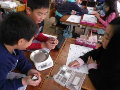 見ためは同じ大きさなので,同じ重さなのかな?と予想する子どもも多かったのですが,実際に手に持ったり,重さを量ったりすると,全然重さがちがうことが分かり,子どもたちはとても驚いていました。