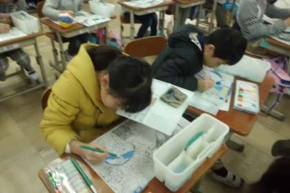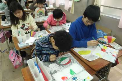 刷り上がった版画の裏から,紙風船の部分に絵の具で色を入れました。