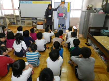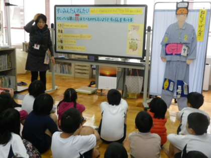 また,計測の前には,佐々木先生によるシリーズ“すいみんたんけんたい”のお話もありました。今回は,寝ている間の体の中(主に食べた物がうんこになるまで)の様子について教えていただきました。みんなはぐっすり寝ているけれど,その間にも体の中では胃や腸がしっかり働いているということがよくわかりました。