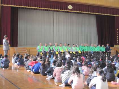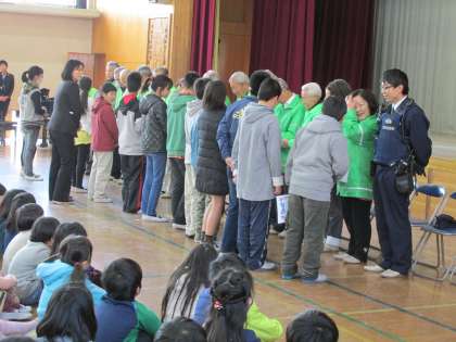 感謝の会は,いつもお世話になっている,学校安全ボランティア,交通安全推進委員の皆様,スクールガードリーダー,砂川交番のおまわりさんに,保健委員会の子どもたちから手作りの賞状を感謝の気持ちを込めて贈りました。