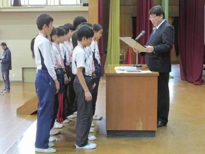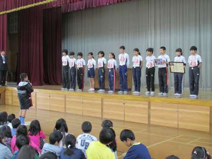 まず,6年生全員がその場に立ち,代表12名が壇上に上がりました。そこで,全市第9位の賞状を校長先生から受け取りました。また,練習でお世話になった京都府警察学校へ報告に行った際,記念撮影した写真も披露しました。賞状と写真は校長室の廊下に飾ってあります。ぜひご覧ください。