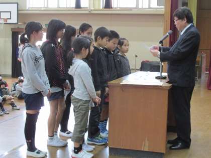 書初め展,全市子ども会美術展,支部巡回展,版画,読書感想文において特選,入選というすばらしい結果,支部バレーボール交流会,支部卓球交流会において優勝,準優勝という優秀な成績を手にし,校長先生から賞状をいただきました。