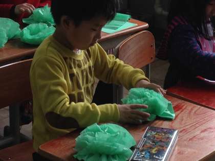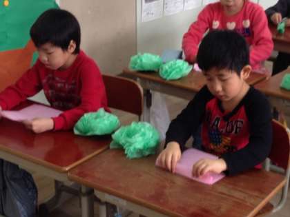 1年生はもうすぐ2年生になります。入学してくる新1年生のために飾り作りを頑張っています。昨日は「はながみ」を使って、お花作りをしました。はながみを何枚か重ねて蛇腹に折ります。真ん中をホッチキスで留めて、後は一枚ずつ丁寧に花弁を作るように広げていきます。自分でこんなに綺麗なお花が作れることに驚いていました。上手に作れましたね。新1年生もきっと喜んでくれる素敵な飾りができました。これから教室を華やかにしていきます。