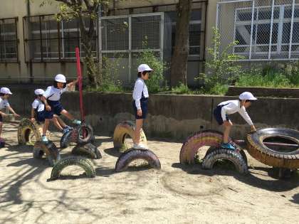 砂川小学校には,タイヤの遊具がいくつかあります。