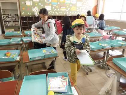 「おはようございます!」と毎日元気に教室に入ってくる子どもたち。最初の課題は,朝の用意。ランドセルを開けて,教科書を出して,連絡帳を出して,名札をつけて…たくさんすることがあります。そんな時,高学年のお兄さんお姉さんが手伝ってくれています。「自分でできるようになったね!」と優しい声かけをしてくれています。