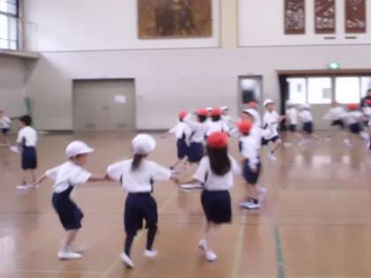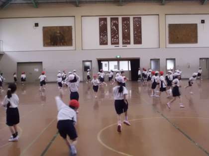 体育はあいにくの雨。体育館で1年生全員でおにごっこをしました。最初は「ふえおに」。みんな走るのが速くて,あっという間にみんな鬼になってしまいました。次は,「手つなぎおに」。手をつないだまま走ることの難しさを感じていました。「あっちに走ろうよ。」と相談して,逃げる人を追っていました。次は,どんな鬼ごっこをしようかな。