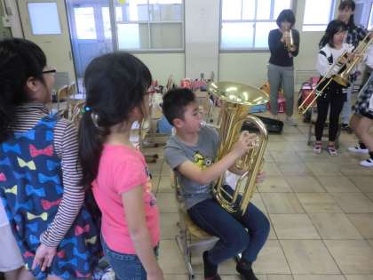 月・水・金に活動する金管バンド部です。今年度から新しくできた部です。吹き方が難しく悪戦苦闘していました。