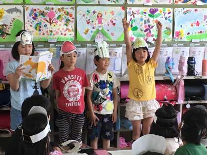 音読発表会に向けて,自分たちでお面を作ったり,せりふの言い方を工夫したり,ふりをつけたりして,よりよい音読ができるように工夫してきました。