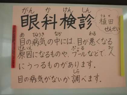 視力が「C」や「D」だと,黒板の字も見にくく学習に影響が出てくることがあります。「眼科の結果」とあわせて「視力の結果」もお渡ししますので,受診をお願いします。