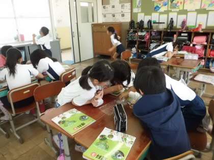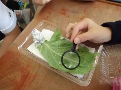小さくて黄色いモンシロチョウのたまごや緑色のよう虫を見て,歓声があがっています。飼育の仕方も学習しました。